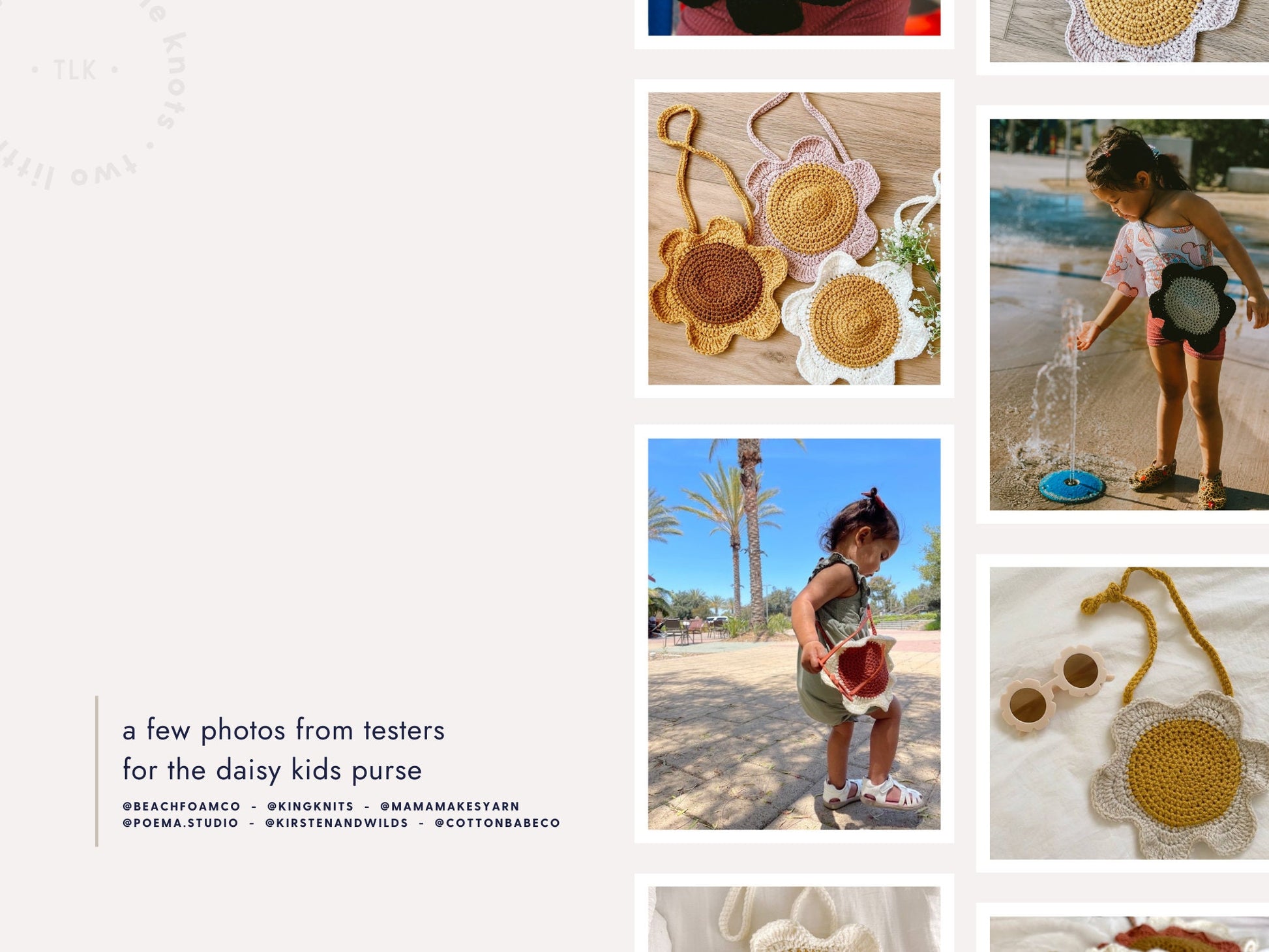 Please follow and tag @twolittleknots and hashtag #twolittledaisies on Instagram for your work to be featured. I would love to see your own daisy purses being made and the colors you choose!
