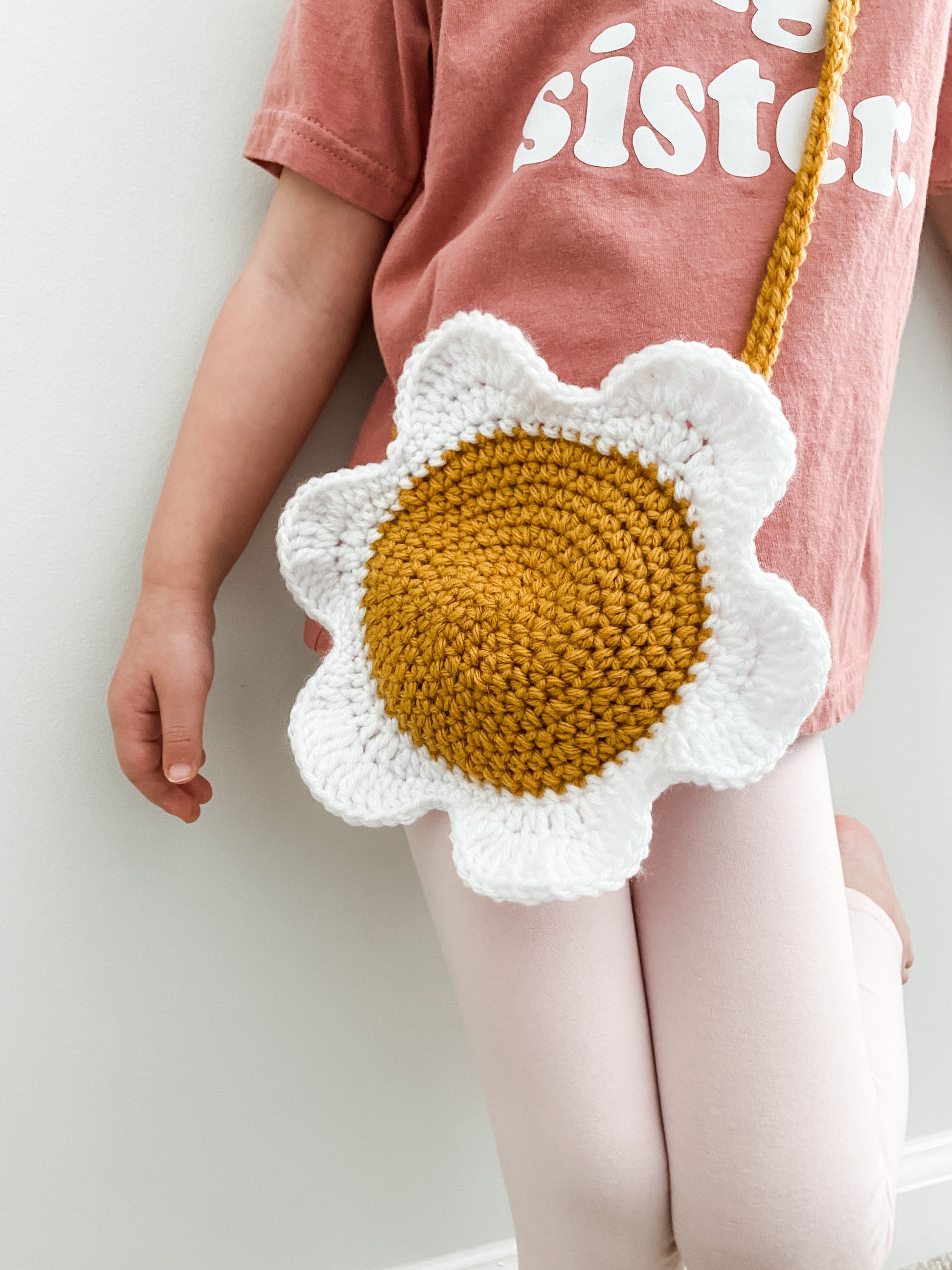 Inspired by my girls' matching daisy pajamas, this bag is designed to be a cute accessory for little ones of virtually any age. It's lightweight and just big enough to fit little trinkets and goodies for pretend play, dress up, or the adventures little ones go on. This daisy purse adds a fun pop of color to any outfit, in any weather!