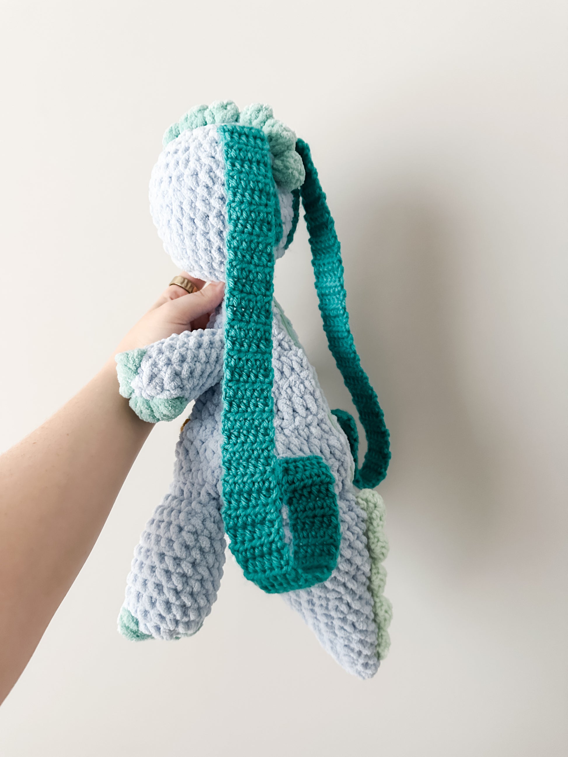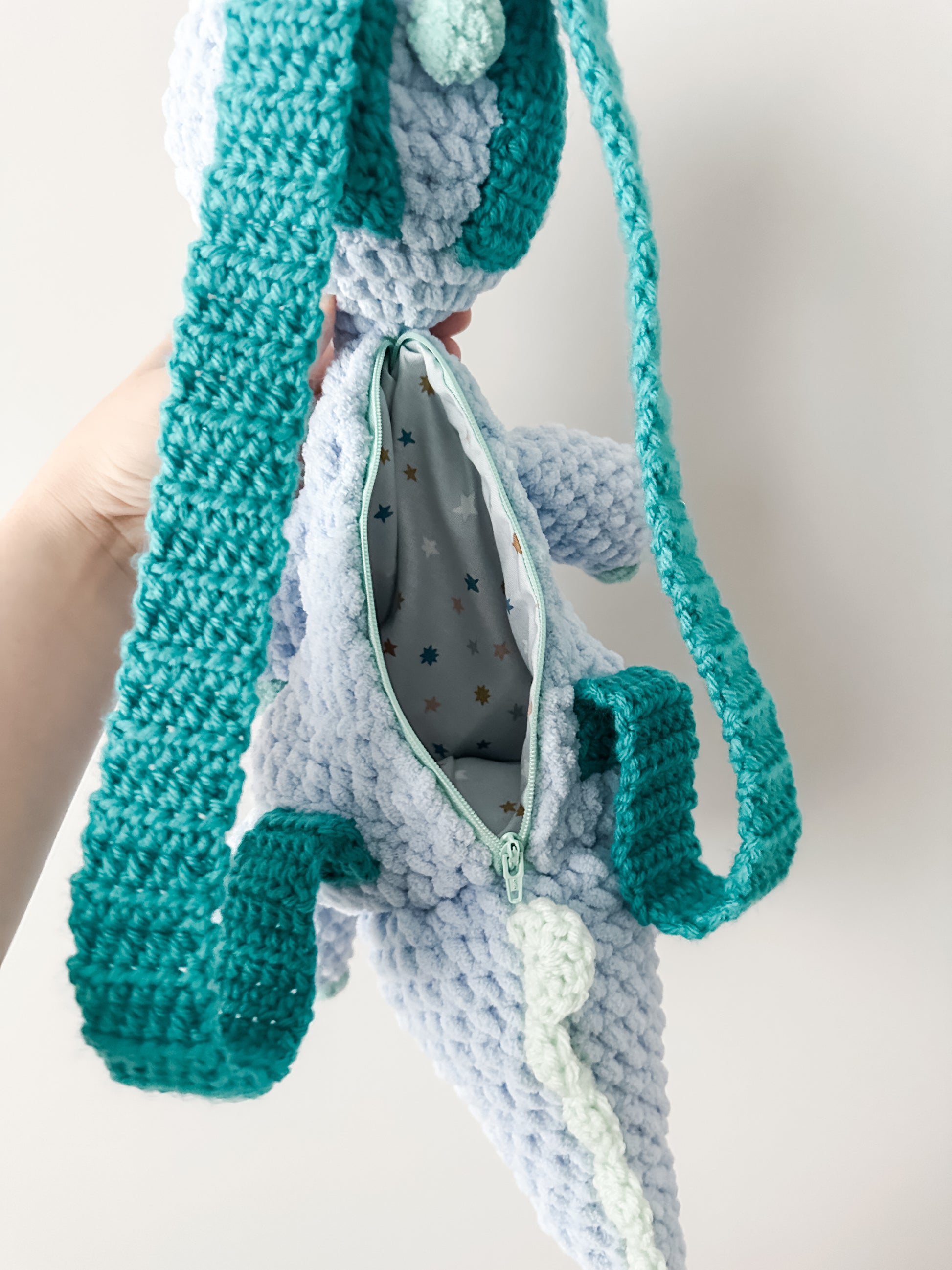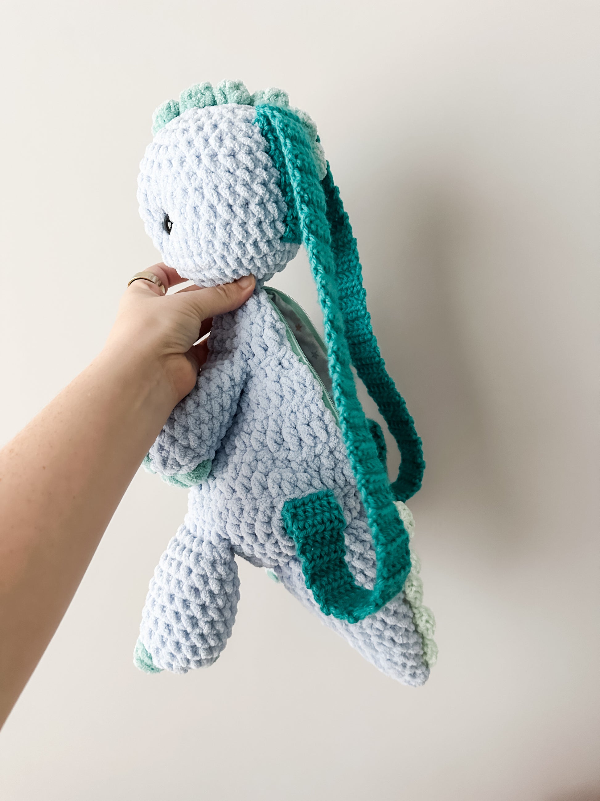 Meet the cutest little adventure companion! This handmade dinosaur backpack is lovingly crafted from start to finish — from the soft, plush crochet body to the fully lined interior with a sturdy zipper closure. Every stitch is made by hand, making this backpack truly one of a kind.