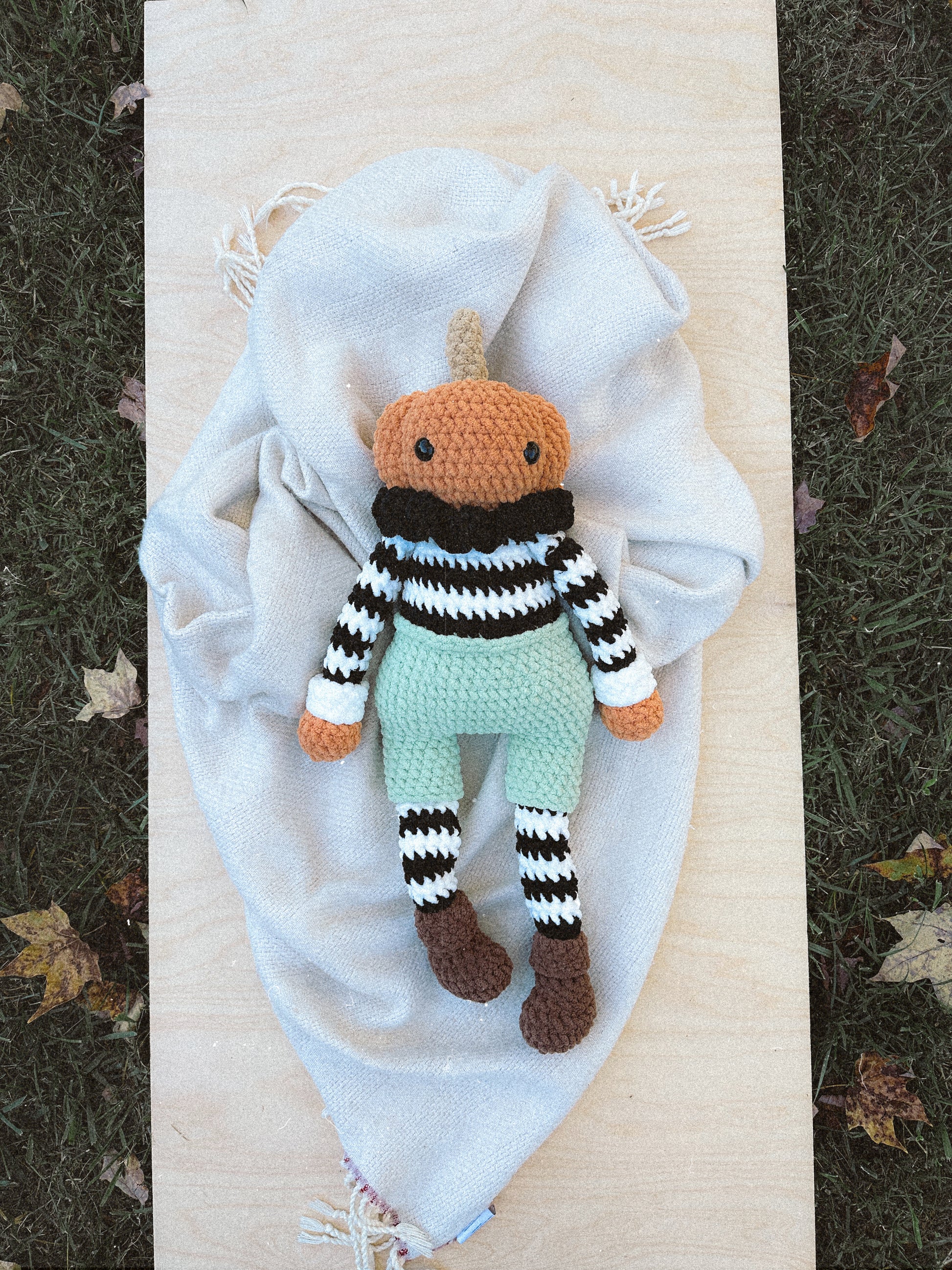 Lovingly handmade with ultra-soft, plush yarn, this one-of-a-kind pumpkin-headed doll stands approximately 25 inches tall. With his striped black-and-white shirt, minty green pants, ruffled black collar, and cinnamon-colored pumpkin head (complete with a stem!), he's a delightful mix of charm and seasonal flair.