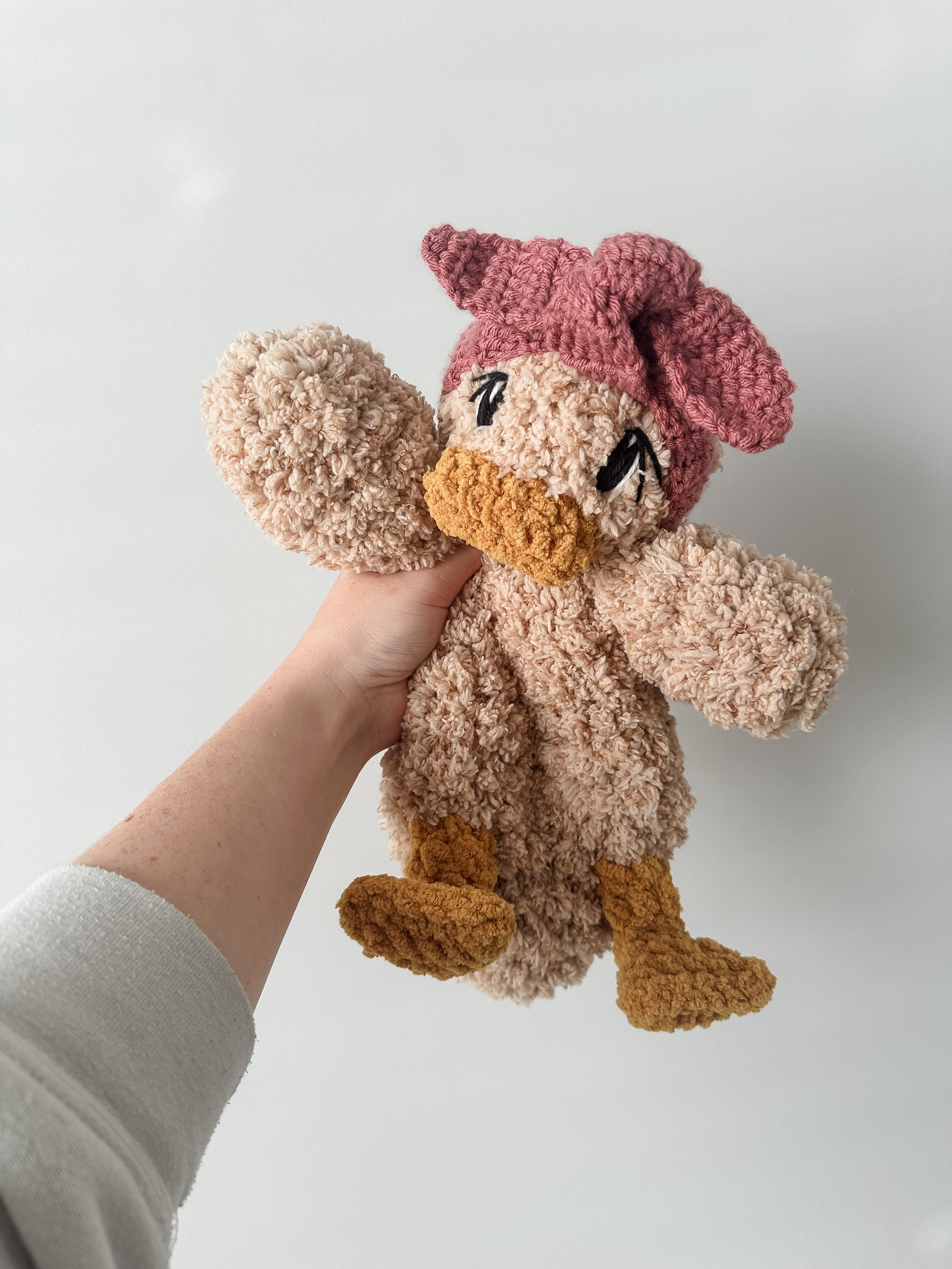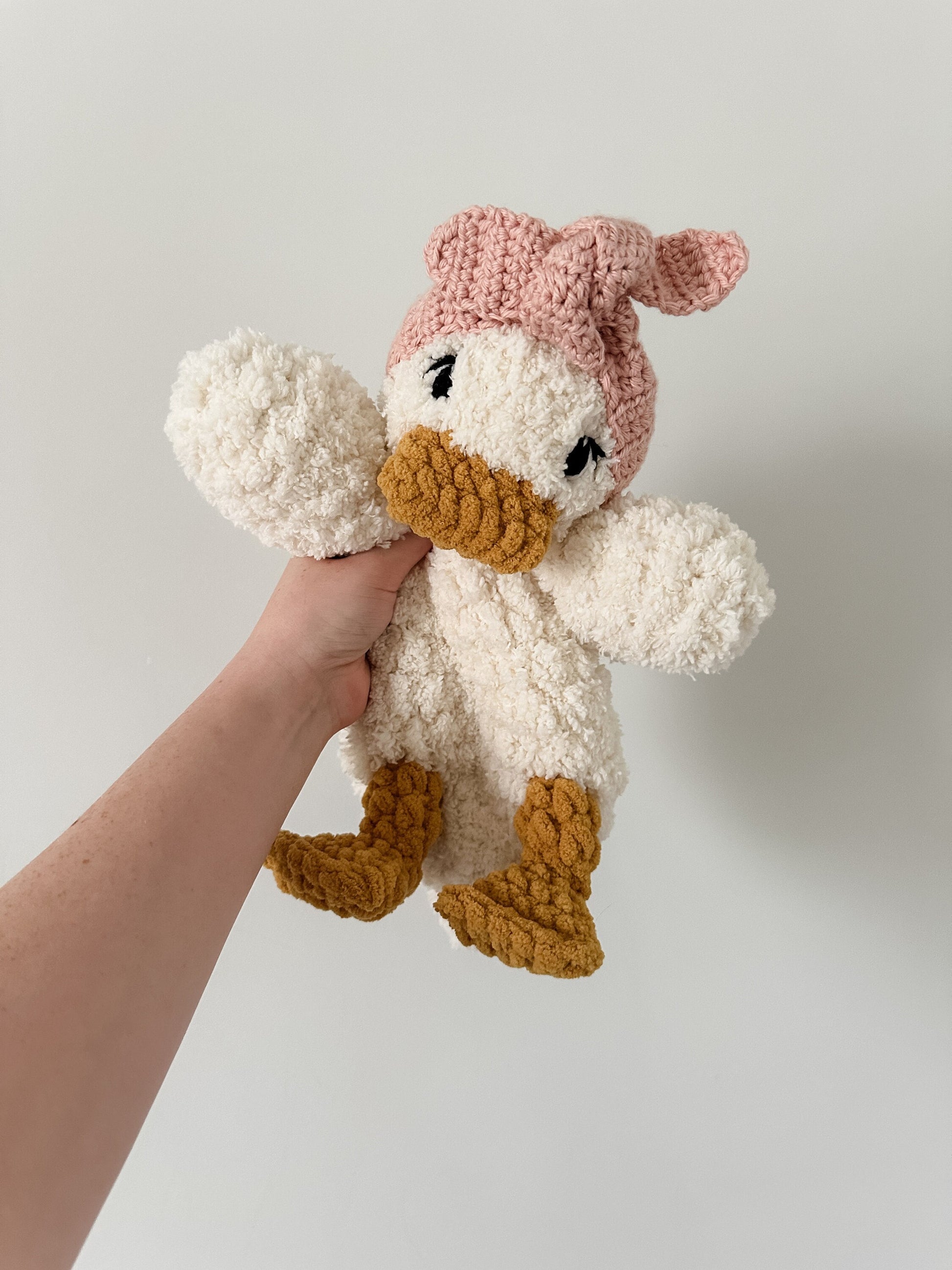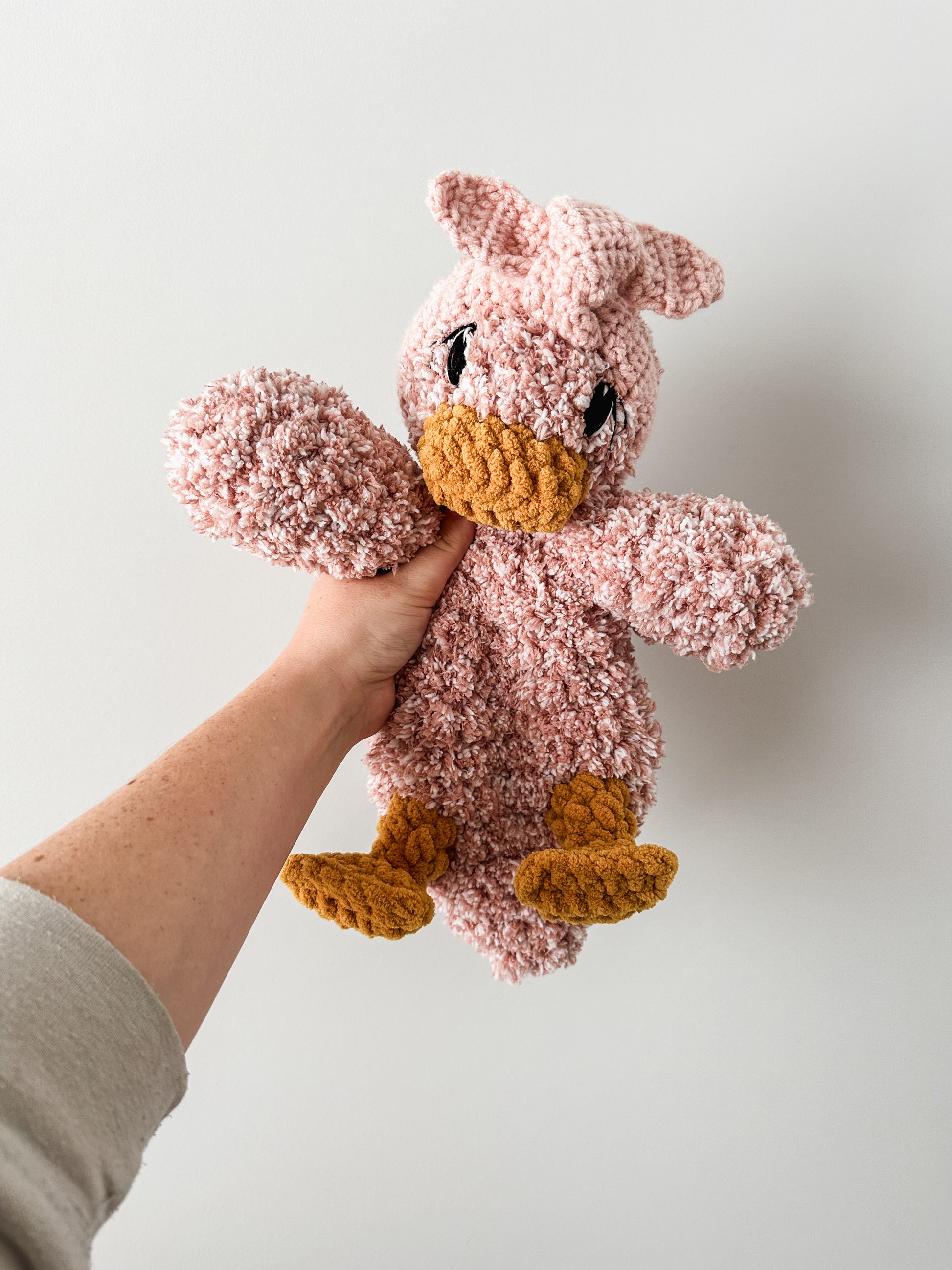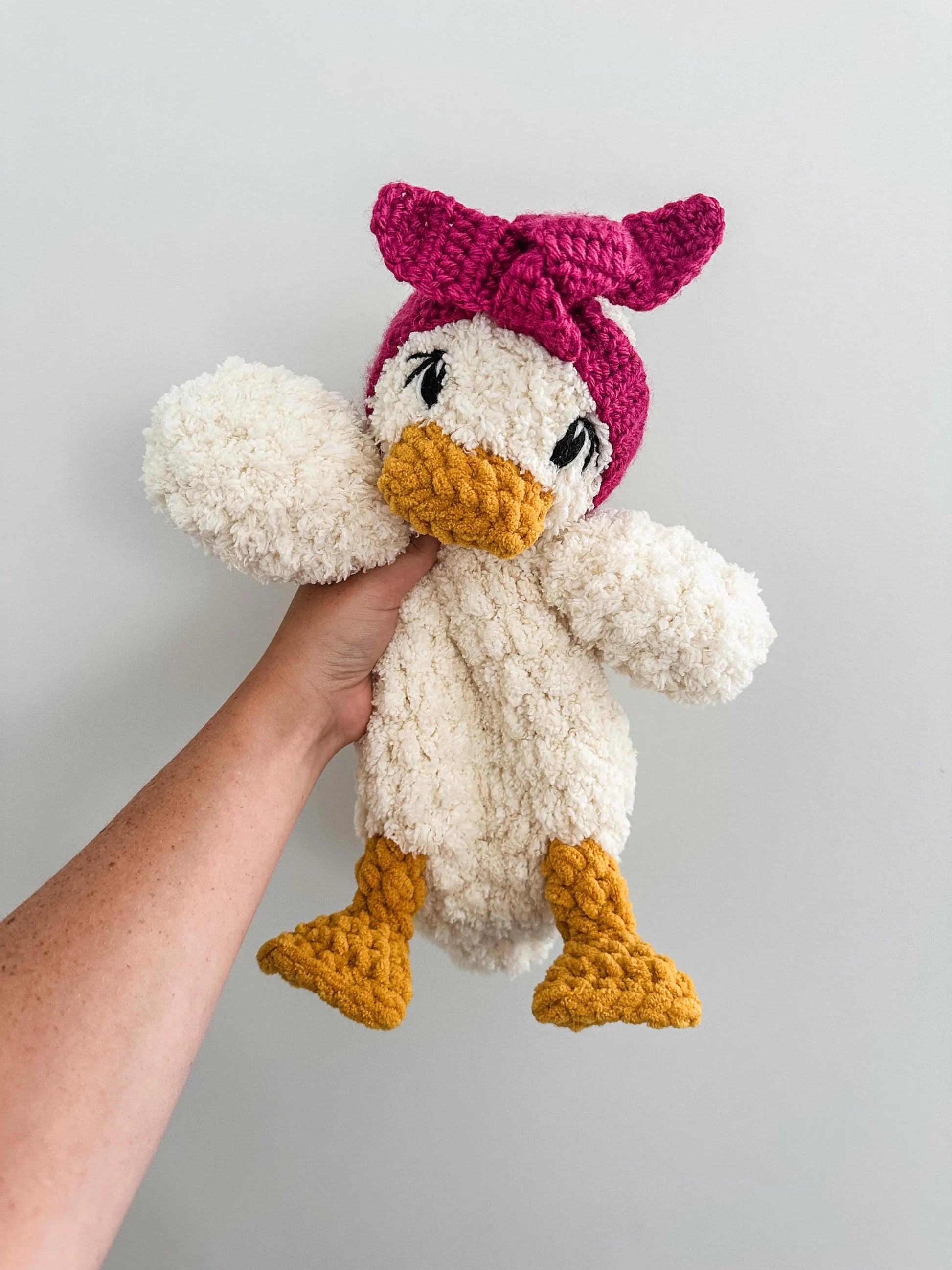 This della duck lovey is the perfect companion for kids. It pairs a unstuffed body that gives the feel of a blanket lovey with a stuffed head making the perfect, lovable hybrid for little hands. Not to mention the fuzzy yarn makes it incredible soft - your little one won't want to let it go!