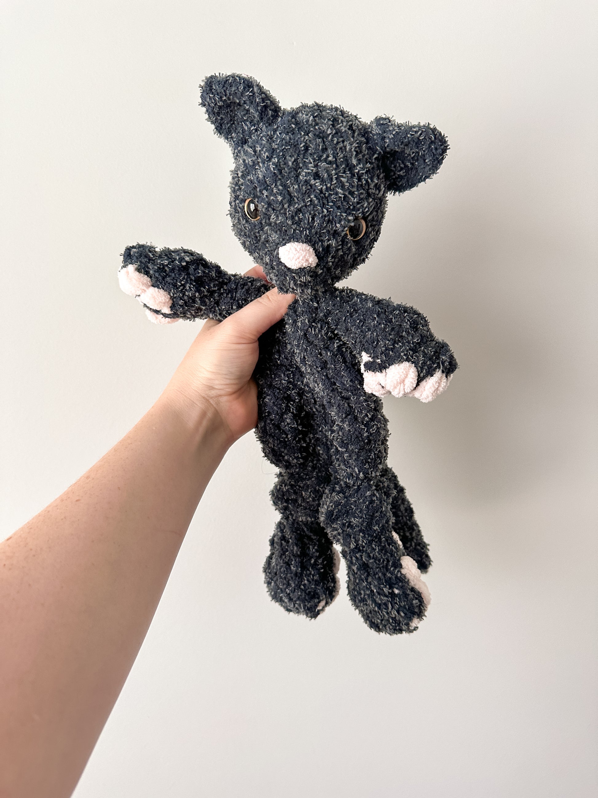 This cat is made in the USA with polyester yarn and hypoallergenic polyester fiberfill.