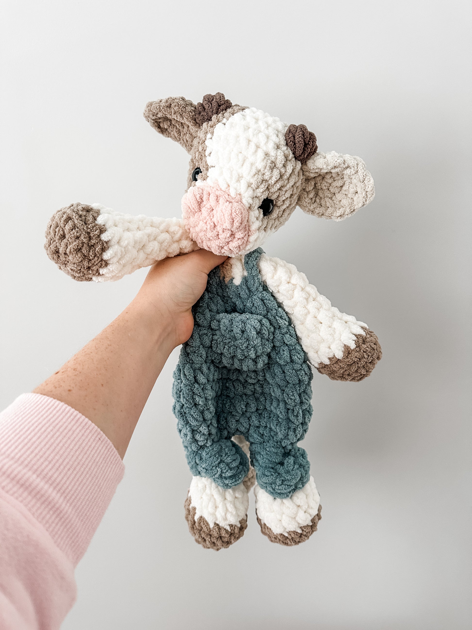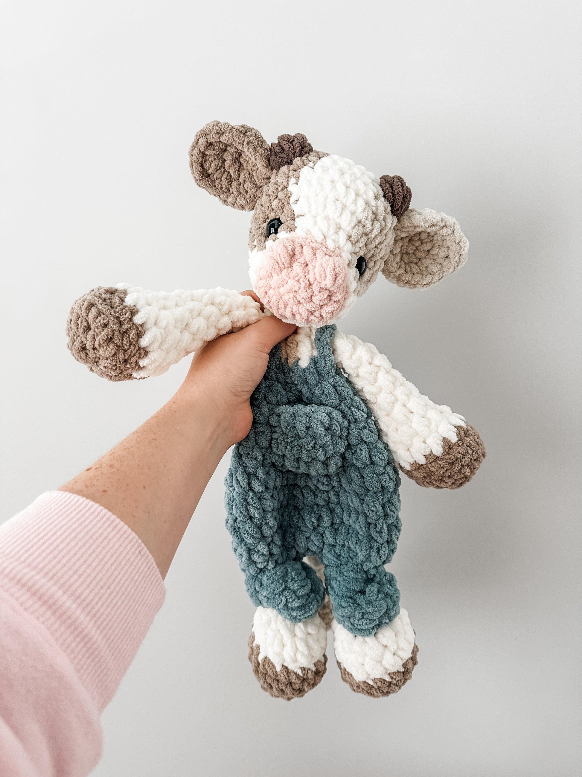 This adorable cow is dressed in its overalls and ready for adventures with your little one! It features a stuffed head paired with an unstuffed body to make them the perfect hybrid lovey for little hands.